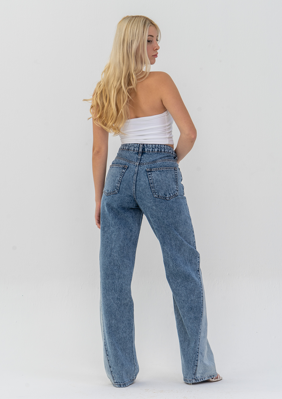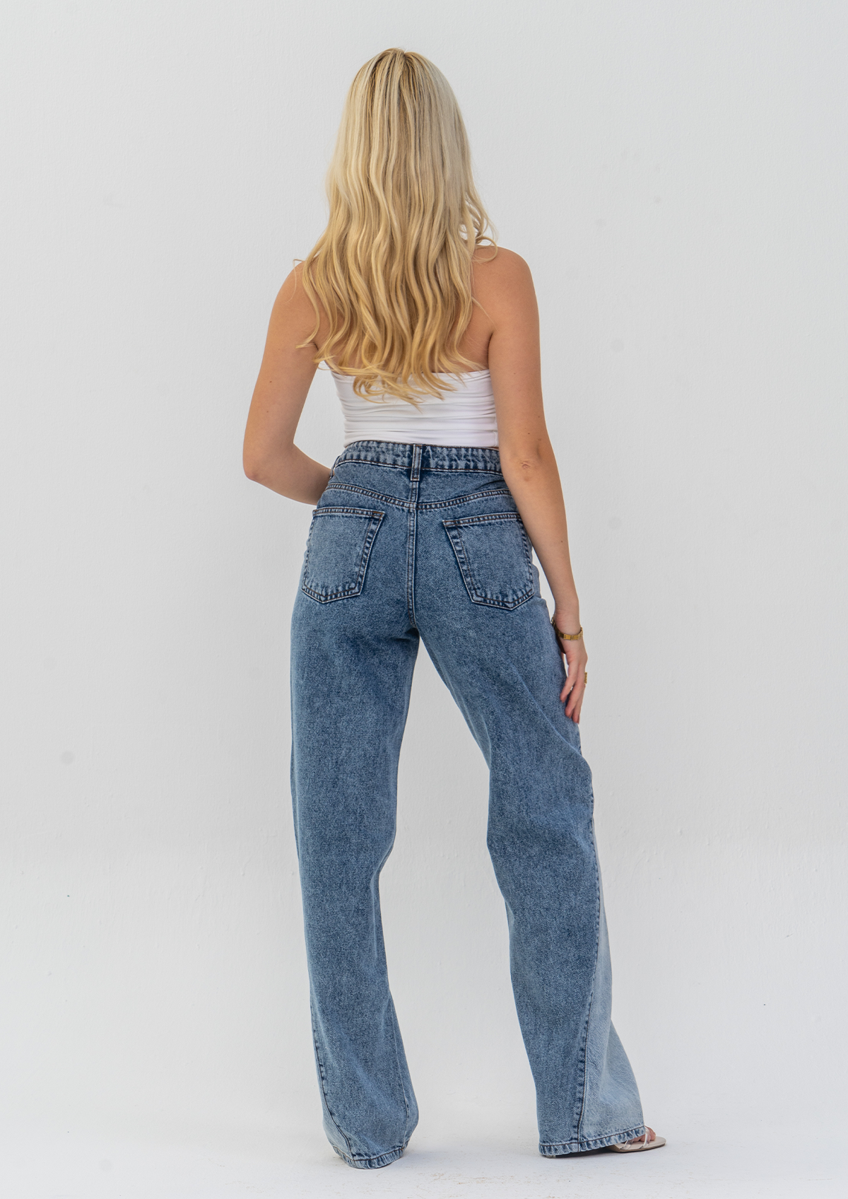 This jeans is in Non-Stretch fabric, 100% Cotton. The Colour is a contrast of Acid Wash and Light Blue . The Model is Wearing UK Size 6 and her height is 164 CM. The inseam is 81 CM.